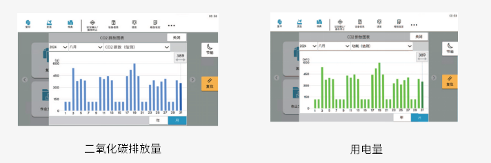 为提升环保意识,新系列机型可将设备运行期间的耗电量及二氧化碳(CO2)排放量以图表形式直观显示。通过设备操作面板或者Command Center,可按按月或按日进行切换查看。